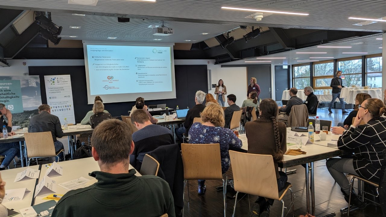 Was auf kommunaler Ebene alles möglich ist, zeigten Alicia Frey (Wirtschaftsförderung) und Hannah Link (Klimaschutzmanagement) der Stadt Haar. Dort hat man sich 2020 auf den Weg gemacht, zur „Circular City" zu werden – und das nicht aus reinem Altruismus: Man sieht Kreislaufwirtschaft als ein Alleinstellungsmerkmal und will damit einen für Unternehmen auch in Zukunft attraktiven und resilienten Wirtschaftsstandort schaffen. Mit einem Bürgermeister und einer kommunalen Verwaltung, die hinter der Zielsetzung stehen und sie konsequent verfolgen, wurden in Haar viele große und kleine Projekte angestoßen und umgesetzt, unter anderem ein zirkuläres Gewerbegebiet, ein Jugendfreizeitzentrum aus wiederverwendeten Bauteilen, einen Mehrwerthof als lokaler Ort für Wiederverwendung und Upcycling sowie regelmäßige Veröffentlichungen zu „Circular Tipps" im „Rathaus-Blatt".