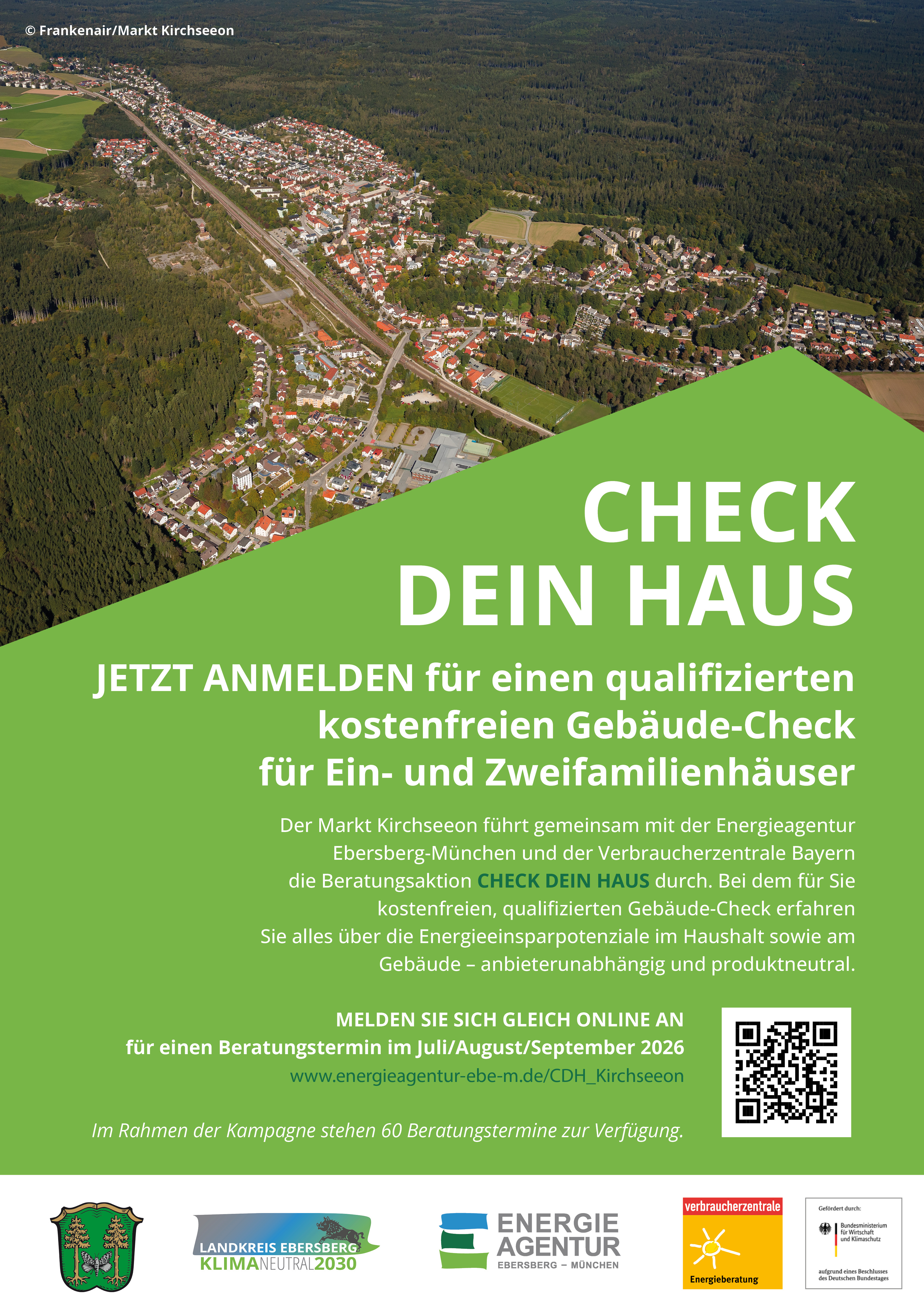 Wenn Sie Eigentümerin oder Eigentümer eines Ein- oder Zweifamilienhauses in der Gemeinde Kirchseeon sind, melden Sie sich jetzt hier (Link) für die Teilnahme an „Check Dein Haus" an.