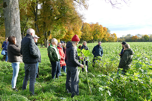 Während eines Rundgangs wurden verschiedene Maßnahmen vorgestellt, die die Biodiversität fördern und CO2 im Boden speichern. Dazu zählen der Anbau von Zwischenfrüchten, die Reduktion von Herbiziden durch Untersaaten sowie eine schonende Bodenbearbeitung.