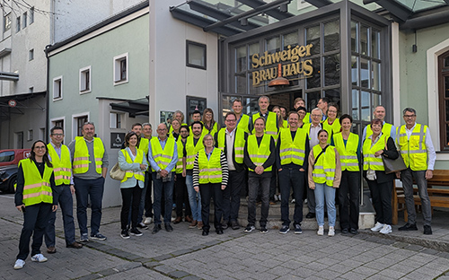 Einblicke in die praktische Umsetzung der wertorientierten Braukultur bei Schweiger erhielten die Teilnehmenden bei einer Führung durch Brauerei und Abfüllanlage. Erich Schweiger zeigte, was das Unternehmen bereits in Sachen Nachhaltigkeit umgesetzt hat: Bezug der Rohstoffe aus einem Umkreis von maximal 15 Kilometern, eine Solaranlage mit über 620 Modulen auf dem Firmendach, Wärmerückgewinnung, fast ausschließlich Mehrwegflaschen und wiederverwendbare Fässer, die Reststoffe aus der Produktion werden von Landwirten zur Tierfütterung eingesetzt. Der Betrieb ist „slow brewing" zertifiziert – laut Erich Schweiger, der durch das Unternehmen führte, das härteste Biersiegel weltweit, das neben der Qualität des Bieres auch Nachhaltigkeitsaspekte berücksichtigt.