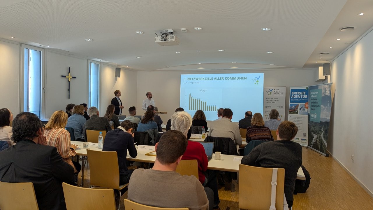 Ein Schwerpunkt des Treffens war der Austausch über die Zielsetzungen innerhalb der dreijährigen Netzwerkphase. Sebastian Gröbmayr vom Institut für nachhaltige Energieversorgung (INEV), das gemeinsam mit der Energieagentur Ebersberg-München die Kommunen bei der Entwicklung und Umsetzung von Maßnahmen unterstützt, stellte das kumulierte Netzwerkziel vor: Insgesamt kommen die 17 beteiligten Kommunen auf rund 1.730 Tonnen CO2-Einsparung pro Jahr, die sich aus Energieeinsparungen errechnen.